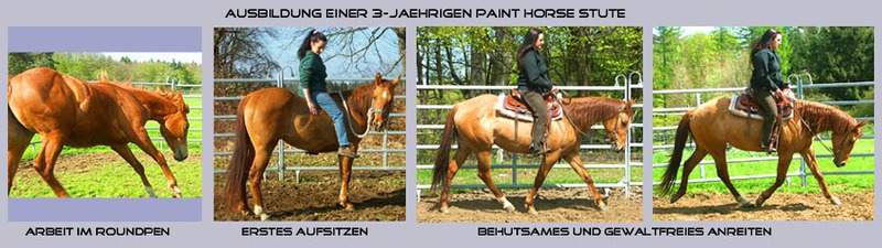 Bei uns werden alle Pferde mit viel Verständnis und gewaltfrei auch im Gelände ausgebildet. Zuerst lernt das Pferd “geradeaus”, im Takt und im Gleichgewicht ohne und mit Reiter in allen 3 Grundgangarten zu laufen.