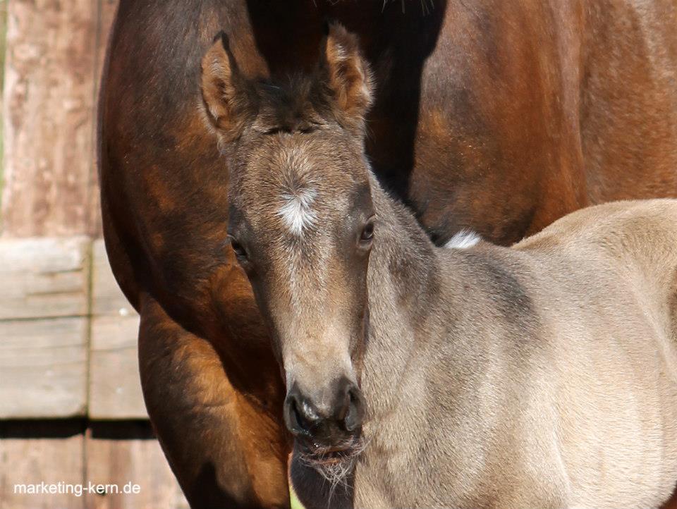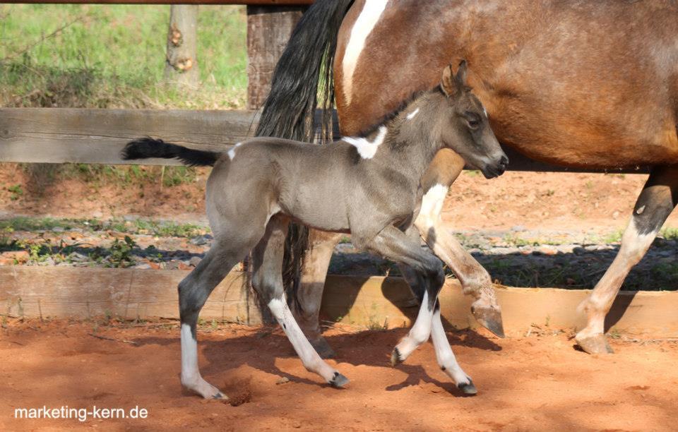 Auf den Fotos ist Gina's Fohlen von 2013 zu sehen. Er ist ein Buckskin-Tobiano-Hengst, ebenfalls homozygot für Tobiano und absolut cool und brav...
