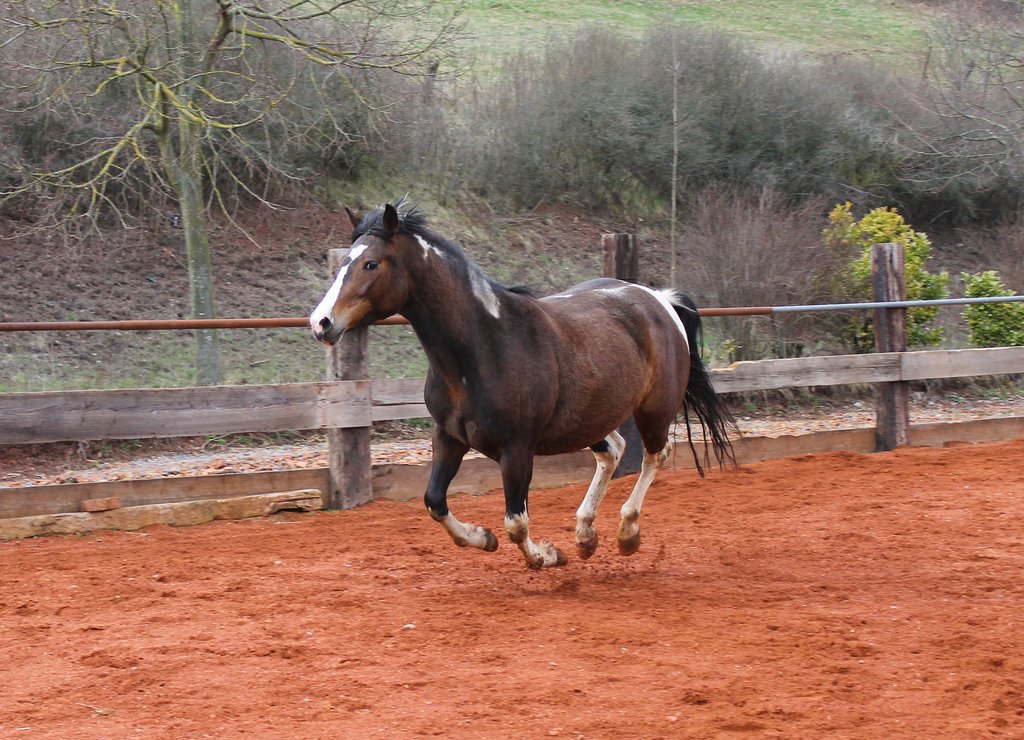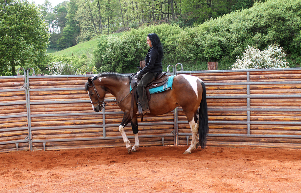 Sie ist sehr brav und ganz lieb im Umgang, fährt problemlos im Anhänger, gibt Hufe und wird jetzt im Roundpen ein wenig in Bodenarbeit geschult.