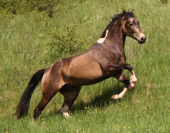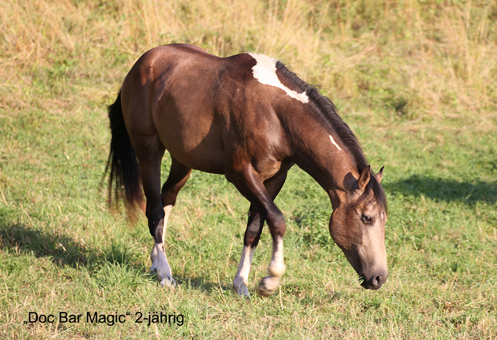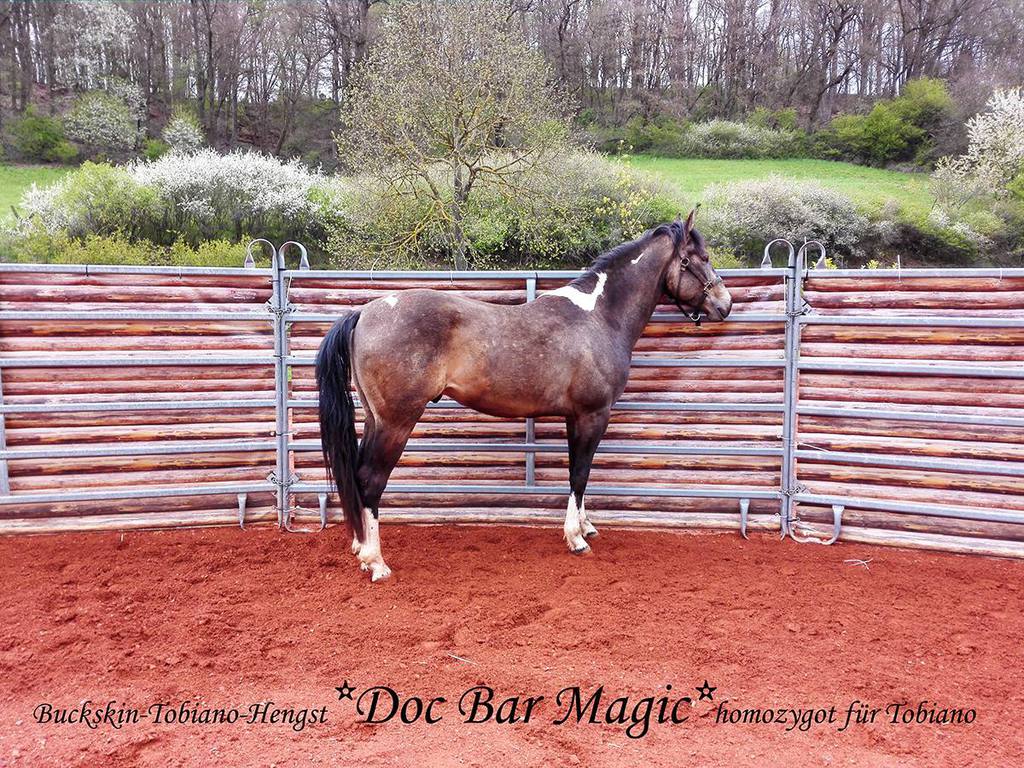 "Doc Bar Magic" ist ein braver 5-jähriger Paint Horse Hengst in schicker Buckskin-Tobiano-Zeichnung mit viel Farbe.