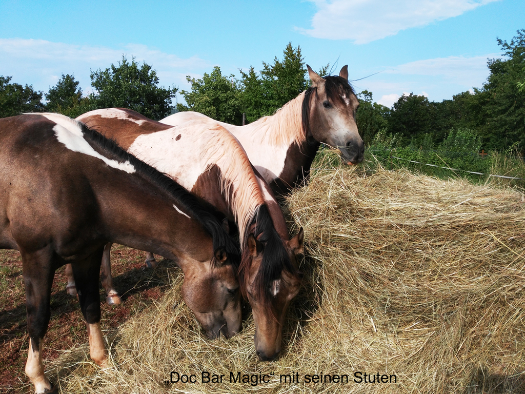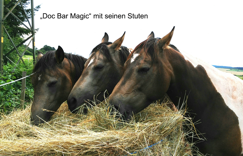 "Doc Bar Magic" steht teilweise mit 2 Stuten oder Junghengsten zusammen. Er ist absolut problemlos im Umgang und Herdenhaltung gewöhnt und wirklich ein braver und ruhiger Hengst!