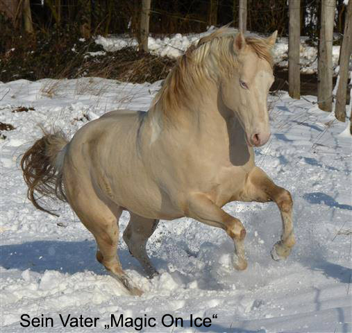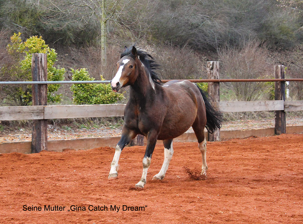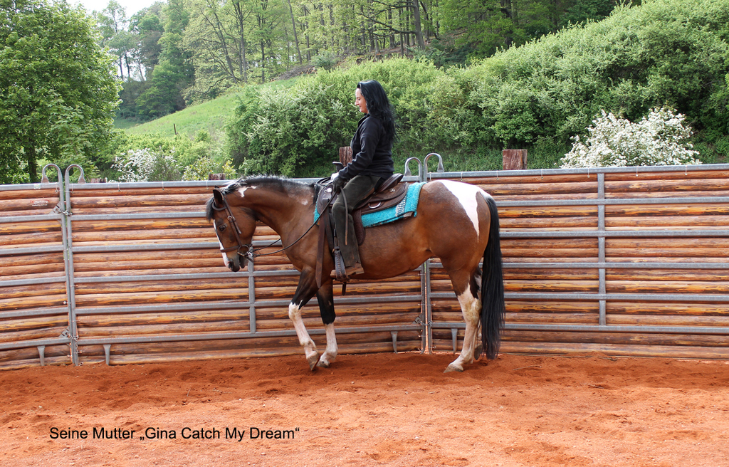 Er vererbt laut Gentest zu 100 % die Tobiano-Scheckung und hat ein korrektes Exterieur und einen ruhigen und lieben Charakter. Sein Pedigree beeinhaltet altbewährte Cowhorse-und